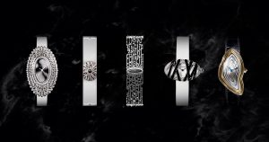 And the final model in the series is the Baignoire Interdite, or “forbidden bath”. It’s a traditional Baignoire shape, except one turned 90 degrees on its side, with the front crisscrossed in strips covered in black amorphous diamond-like carbon. In between the black bands peek diamonds set onto the bezel.